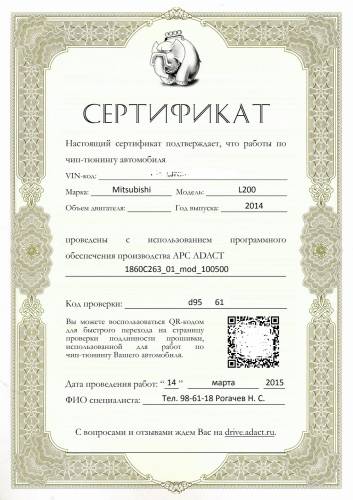 Обращаем Ваше внимание, что официальный представитель ООО АРС АДАКТ http://adact2.ru/informatziya-o-magazine/otzyivyi/ имеет именной сертификат, подтверждающий статус представителя, и дающий право предоставлять Вам прошивки производства ООО АРС АДАКТ . Это гарантия того, что Вам установят именно ту прошивку за которую вы оплатите в последней редакции. Соответственно, это дает Вам право на нашу поддержку и обновление. Не дайте себя обмануть требуйте у мастера сертификат проверки подлинности прошивки это оградит вас от подделки и потере времени. | |
